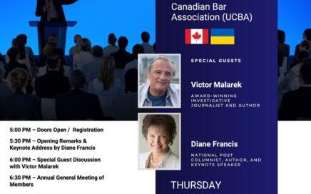 Join the Ukrainian Canadian Bar Association (UCBA) for its Annual General Meeting of Members on Thursday, November 13, 2025, from 5:00 to 8:00 p.m. at the University Club of Toronto, 380 University Avenue. This year’s program features a keynote address by Diane Francis, National Post columnist, author, and keynote speaker, on Ukraine’s recovery and the […]